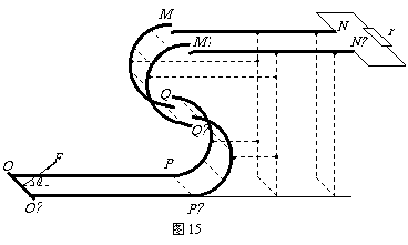 24.(20分)如图15所示,固定在上、下两层水平面上的平行金属导轨MN、M′N′和OP、O′P′间距都是l,二者之间固定两组竖直半圆形轨道PQM和P′Q′M′,两轨道间距也均为l,且PQM和P′Q′M′的竖直高度均为4R,两个半圆形轨道的半径均为R。轨道的QQ′端、MM′端的对接狭缝宽度可忽略不计,图中的虚线为绝缘材料制成的固定支架,能使导轨系统位置固定。将一质量为m的金属杆沿垂直导轨方向放在下层金属导轨的最左端OO′位置,金属杆在与水平成θ角斜向上的恒力作用下沿导轨运动,运动过程中金属杆始终与导轨垂直,且接触良好。当金属杆通过4R距离运动到导轨末端PP′位置时其速度大小vP=4