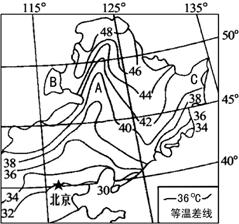 31.读“中国东北部地区气温年较差分布图”(左图)和“美国本土气温年较差分布图”(右图),回答下列问题。(14分)