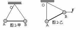 如图2-甲所示,轻质细杆AB两端分别固定着质量均为m的小球,用两根不可伸长的轻质细线系住两球悬挂于O点,且OAB恰好为一正三角形,此时OB线的张力为F1,现对B球施加一水平拉力F,使OA保持竖直方向(如图2-乙所示),此时此时OB线的张力为F2,则与F2的关系正确的是:( )