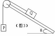 如图3所示,倾斜放置的木板上固定有一光滑滑轮,质量为M、m的Q、P两物体用轻质的细绳连接后绕过滑轮,物体Q静止在木板上。已知M=2m,开始木板的倾角为θ,现增加θ角,如果系统仍然能够保持静止状态,则θ角增加过程中下列说法错误的是:( )
