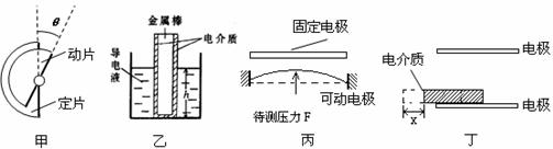 传感器是把非电学物理量(如位移、速度、压力、角度等)转换成电学物理(如电压、电流、电量等)一种元件。图所示中的甲、乙、丙、丁是四种常见的电容式传感器,下列说法正确的是