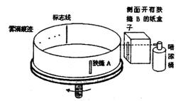 (2) 若将喷枪和开有狭缝的纸盒置于转台上(如右图)。喷枪固定于转轴上不随台转动,而纸盒随转台转动,且使狭缝A和狭缝B始终正对。开动转台,转台以角速度