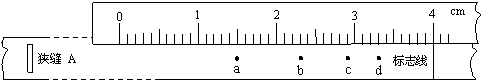 稳定转动后,开始喷漆。仅当狭缝A和B正对平行时,雾滴才能在纸带内侧留下痕迹。改变喷射速度重复实验,在纸带上留下了一系列的痕迹 a、b、c、d。将纸带取下放在刻度尺下(如下图)。