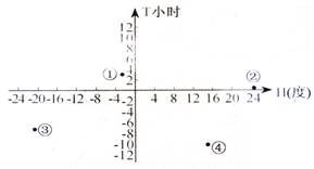 图3为某地(30.7°N,104°E)7时04分(北京时间)日出时,世界四个著名城市与该地正午太阳高度差值(H)和日出时间差值(T)图。据此回答10~11题。