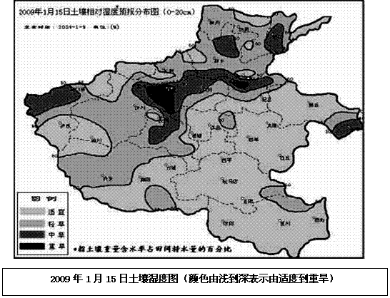 材料1:河南省是我国重要的粮食主产区。据河南省气象局专家介绍,自2008年11月下旬以来至09年2月底,全省平均降水量仅为2.2毫米,较常年同期偏少9成多,为1961年以来同期最少值。全省农作物受旱面积之大,时间之长,程度之重,都为新中国成立以来所少有据统计,近六成的麦田受旱,有三百六十多万亩出现黄苗,有四十多万亩出现枯苗死苗现象。
