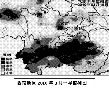 材料二 西南大旱是2010年发生于中国西南五省市云南、贵州、广西、四川及重庆的百年一遇的特大旱灾。一些地方的干旱天气可追溯至2009年7月。3月旱灾蔓延至广东、湖南等地以及东南亚湄公河流域。截至3月30日,中国耕地受旱面积1.16亿亩,其中作物受旱9068万亩,重旱2851万亩、干枯1515万亩,待播耕地缺水缺墒2526万亩。