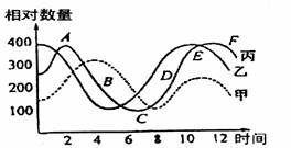 (12分)下图为一定时间内某生态系统中几个种群的数量变化曲线,请回答: