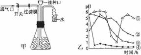 (2008江苏卷,生物,19)图甲是果醋发酵装置。发酵初期不通气,溶液中有气泡产生;中期可以闻到酒香;后期接种醋酸菌,适当升高温度并通气,酒香逐渐变成醋香。图乙中能表示整个发酵过程培养液pH变化的曲线是( )