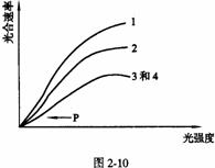 24. 在表2-5中四种实验条件下,测定了不同光照强度对光合作用速率的影响,结果如图2-10所示。表2-5