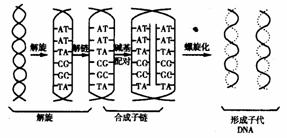 (1)解旋:亲代DNA在解旋酶的作用下,把两条螺旋的双链解开,形成两条单链(母链)。解旋是使两条链之间的氢键断裂,需ATP提供能量。