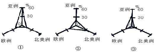 图7为2005年亚洲、欧洲、北美洲(不包括墨西哥)的谷物进、出口量和生产量占世界的比例图。