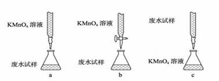 精确量取20.00 mL不含其它杂质的废水试样,选择使用紫色的0.1 mol·L-1KMnO4(H2SO4酸化)溶液进行滴定;(有关反应为:2MnO4-+5SO32-+6H+=2Mn2++5SO42-+3H2O);记录数据,计算。
