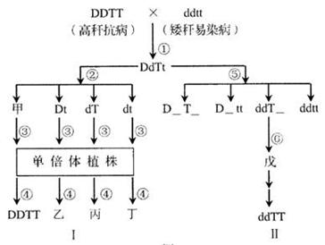 下图所示Ⅰ和Ⅱ是利用高秆抗锈病(DDTT)、矮秆易染锈病(ddtt)两个水稻品种获得纯种矮秆抗锈病水稻新品种的育种方法,两对基因独立遗传。请分析回答: