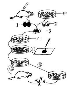 (3)为了能充分发挥上述两种细胞各自的特点,经特殊处理,在促细胞融合因子的作用下,使两种细胞发生融合,形成图中的细胞3,这种细胞称为 。把它在乙培养皿中进行培养,则能产生大量的细胞群,这种方法称为 。