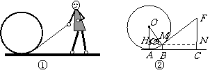 如图①②,图①是一个小朋友玩“滚铁环”的游戏,铁环是圆形的,铁环向前滚动时,铁环钩保持与铁环相切.将这个游戏抽象为数学问题,如图②.已知铁环的半径为5个单位(每个单位为5cm),设铁环中心为O,铁环钩与铁环相切点为M,铁环与地面接触点为A,∠MOA=α,且sinα=