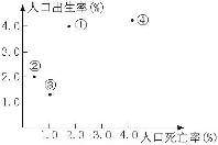 右图反映四个国家的人口出生率和死亡率,其中,人口增长模式属于“高高低”的国家是
