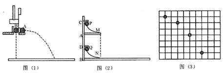 (2)乙同学采用如图(2)所示的装置。两个相同的弧形轨道M、N,分别用于发射小铁球 P、Q,其中N的末端与可看作光滑的水平板相切;两轨道上端分别装有电磁铁C、D;调节电磁铁C、D的高度,使AC=BD,从而保证小铁球P、Q在轨道出口处的水平初速度v0相等,现将小铁球P、Q分别吸在电磁铁C、D上,然后切断电源,使两小铁球能以相同的初速度v0同时分别从轨道M、N的下端射出。实验可观察到的现象应是____ __ 。仅仅改变弧形轨道M的高度,重复上述实验,仍能观察到相同的现象,这说明______________ 。