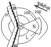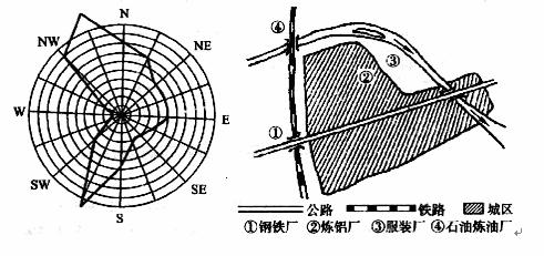 下图为某城市一年中各风向出现的频率及该市工业区划图,据图回答23-24题。