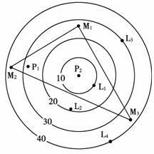 22. P2是企业乙的运费最低点。以P2点为圆心的同心圆是企业乙的等运费线,即企业乙从P2点移动而产生的单位产品运费(货币单位:元)增加额相同点的连线。假设劳动力费用(货币单位:元)从P2点向周围降低,生产单位产品所需劳动力费用在P2点为50元,L1点为42元,L2点为28元,L3点为20元,L4点为15元。当综合考虑运费和劳动力费用时,企业乙将从P2点移向: