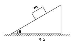 21、如图21所示,一上表面粗糙的斜面体放在光滑的水平地面上,斜面的倾角为θ。若斜面固定,另一质量为m的滑块恰好能沿斜面匀速下滑。若斜面不固定,而用一推力F作用在滑块上,可使滑块沿斜面匀速上滑,若同时要求斜面体静止不动,就必须施加一个大小为P= 4mgsinθcosθ的水平推力作用于斜面体。求满足题意的这个F的大小和方向。
