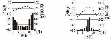 2004年和2008年夏季奥运会分别在雅典和北京举行,图3是两地的气候资料。读图回答9-10题。