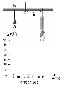 如图所示,小丹设计了一个探究杠杆平衡条件的实验:在一根匀质的木杆中点O左侧固定位置B处悬挂重物A,在中点O右侧用一个弹簧秤向下拉,改变弹簧秤与点O的距离x(cm),观察弹簧秤的示数y(N)的变化情况。实验数据记录如下: