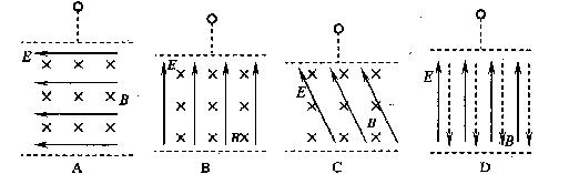 如图所示,空间存在匀强电场和匀强磁场组成的正交或平行的有界电场和磁场区域,电场强度和磁感应强度大小分别为E和B。有一个带正电小球(电量为+q,质量为m)从电磁场上方的某一高度自由落下,从下边缘穿过电磁场区域。带电粒子一定沿直线通过电磁场区域的是下列哪图 ( )