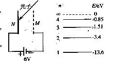 18.如图所示,N为钨板,M为金属网,它们分别与电池两极相连,电池的电动势E和极性已在图中标出,钨的逸出功为4.5eV,现分别用氢原子跃迁发出的能量不同的光照射钨板,下列判断正确的是 ( )