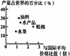 我国加入WTO后,农业面临挑战。根据右图“目前我国主要农产品产量和价格与世界相应标关系图”,回答23-----24题。