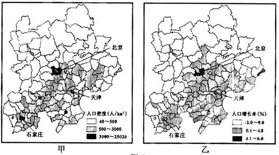 下图甲、乙分别示意京津冀都市圈2000年人口密度分布和人口增长率。完成4-5题。