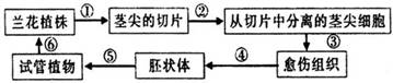 31、(6分)我国植物学家将名贵兰花的茎尖细胞放进培养基中进行培养,最终发育成完整的新植株。下图是细胞培养形成兰花植株示意图,请根据图回答: