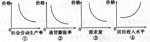 注:其中①②④分别反映的是价格随社会劳动生产率、通货膨胀率、居民收入水平变化的曲线,③反映的是需求量随价格变化的曲线。这些示意图中正确反映价格与相关因素关系的是