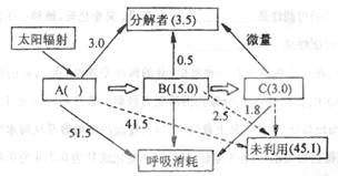 26、(共9分)下图是某湖泊生态系统能量流动的定量分析图解。图中A、B、C代表三个营养级,数字均为实际测得的能量数(单位为百万千焦)。已知该生态系统受到的太阳辐射为