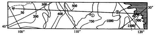 23.综合地价高低、交通便利等因素,此城市廉租房的位置,首先选建在左图中的 A.① B.② C.③ D.④ 24.影响廉租房主轴线与经线斜交成一定角度的最主要因素是 A.采光 B.民俗 C.通风 D.交通 下图是某区域等年降水量线图,读图完成25-26题。