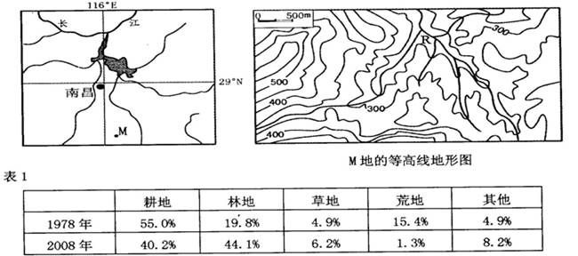 33.(本题30分)下面左图示意我国某区域的水系分布。某学校研究性学习小组对该图中的M地进行实地考察,并查阅了相关资料,发现近三十年来M地生态环境明显改善。右图示意M地的等高线分布,表1示意M地的土地利用结构变化。读图表回答下列问题。
