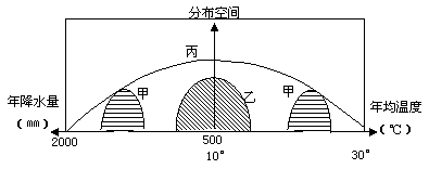 读水稻种植业、商品谷物农业、乳畜业的空间分布范围(曲线与横坐标围成的区域)与热量、水分条件的关系示意图,据图完成10-11题。