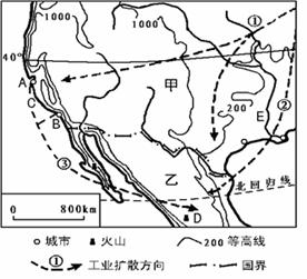 材料二 如图,甲国A、B两城市历史上曾发生多次损失惨重的地震。据研究,AB一带20年内极有可能有大地震。乙国D火山是世界最活跃的火山之一,2005年5月23日再次强烈喷发。![]()