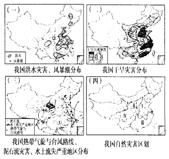 图中(一)、(二)、(三)是我国部分灾害分布示意图,(四)是我国自然灾害区划示意图。读图回答问题。