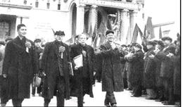 右图是当时上海工商业界代表荣毅仁(右一)等向国家申请全行业