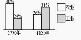 右图反映的是英国近代工业和农业在国民经济中所占比例变化的情况,导致这一变化的主要原因是