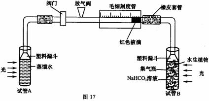 图17表示在充足的光照、适宜的温度等条件下,研究CO2浓度对光合作用速率影响的实验装置。实验前用真空泵抽去两个试管内液体中的气体。请据图回答: