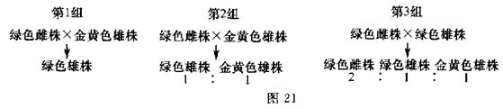 (2)女娄菜是一种雌雄异株的高等植物,其性儿别决定属于XY型。女娄菜的正常植株呈绿色,部分植株呈金黄色,且金黄色仅存在于雄株中(控制该对性状的基因用B、b表示)。图21是某研究小组完成女娄菜的三组杂交实验及结果。