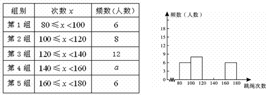 24。统计概率里均有(10湖南怀化)为了进一步了解某校九年级学生的身体素质情况,体育老师对该校九年级(1)班50位学生进行一分钟跳绳次数测试,以测试数据为样本,绘制出部分频数分布表和部分频数分布直方图,图表如下所示: