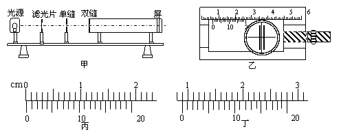 34、某同学用如图甲所示的实验装置,做《用双缝干涉测光的波长》的实验,他用带有游标尺的测量头(如图乙所示)测量相邻两条亮条纹间的距离Δx。转动测量头的手轮,使分划板的中心刻线对齐某一条亮条纹(将这一条纹确定为第1亮条纹)的中心,此时游标尺上的示数情况如图丙所示;转动测量头的手轮,使分划板的中心刻线对齐第6亮条纹的中心,此时游标尺上的示数情况如图丁所示,则图丙的示数x1=___________mm;图丁的示数x2=___________mm。如果实验中所用的双缝间的距离d=0.20mm,双缝到屏的距离L=60cm,则计算波长的表达式λ=_____________(用已知量和直接测量量的符号表示)。根据以上数据,可得实验中测出的光的波长λ=_____________m。