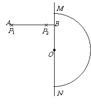 36、利用插针法可以测量半圆柱形玻璃砖的折射率。实验方法如下:在白纸上做一直线MN,并做出它的一条垂线AB,将半圆柱形玻璃砖(底面的圆心为O)放在白纸上,它的直边与直线MN对齐,在垂线AB上插两个大头针P1和P2,然后在半圆柱形玻璃砖的右侧插上适量的大头针,可以确定光线P1 P2通过半圆柱形玻璃砖后的光路,从而求出玻璃的折射率。实验室中提供的器材除了半圆柱形玻璃砖、木板和大头针外,还有量角器等。