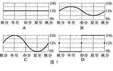 (5)图7为“四个不同地点昼长年变化曲线图”,对应图6上B点的是 ( ▲ )(2分)