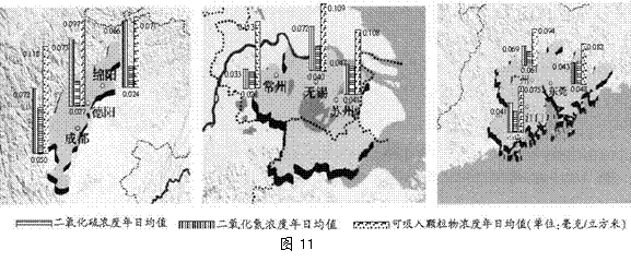 17. 图11为“成都平原、太湖平原、珠江三角洲地级市空气污染综合指标对比图”,读图回答下列问题。(11分)