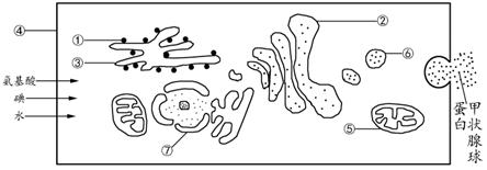 (1)若含18O的氨基酸在甲状腺细胞内合成甲状腺球蛋白过程中产生了H218O,则H218O的生成部位是[ ]____________;水中的18O最可能来自于氨基酸的_______(基团)。