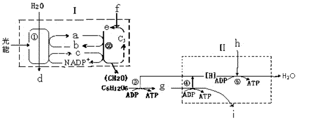 28.(13分)下图为某绿色植物叶肉细胞内发生的物质和能量代谢过程。图中①-⑤为反应过程,a-i为物质,Ⅰ与Ⅱ为结构。据图回答。(在括号内填字母或数字,横线上写文字)