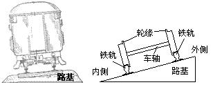在设计水平面内的火车轨道的转变处时,要设计为外轨高、内轨低的结构,即路基形成一外高、内低的斜坡(如图所示)。内、外两铁轨间的高度差在设计上应考虑到铁轨转弯的半径和火车的行驶速度大小。若某转弯处设计为当火车以速率v通过时,内、外两侧铁轨所受轮缘对它们的压力均恰好为零。车轮与铁轨间的摩擦可忽略不计,则下列说法中正确的是( )